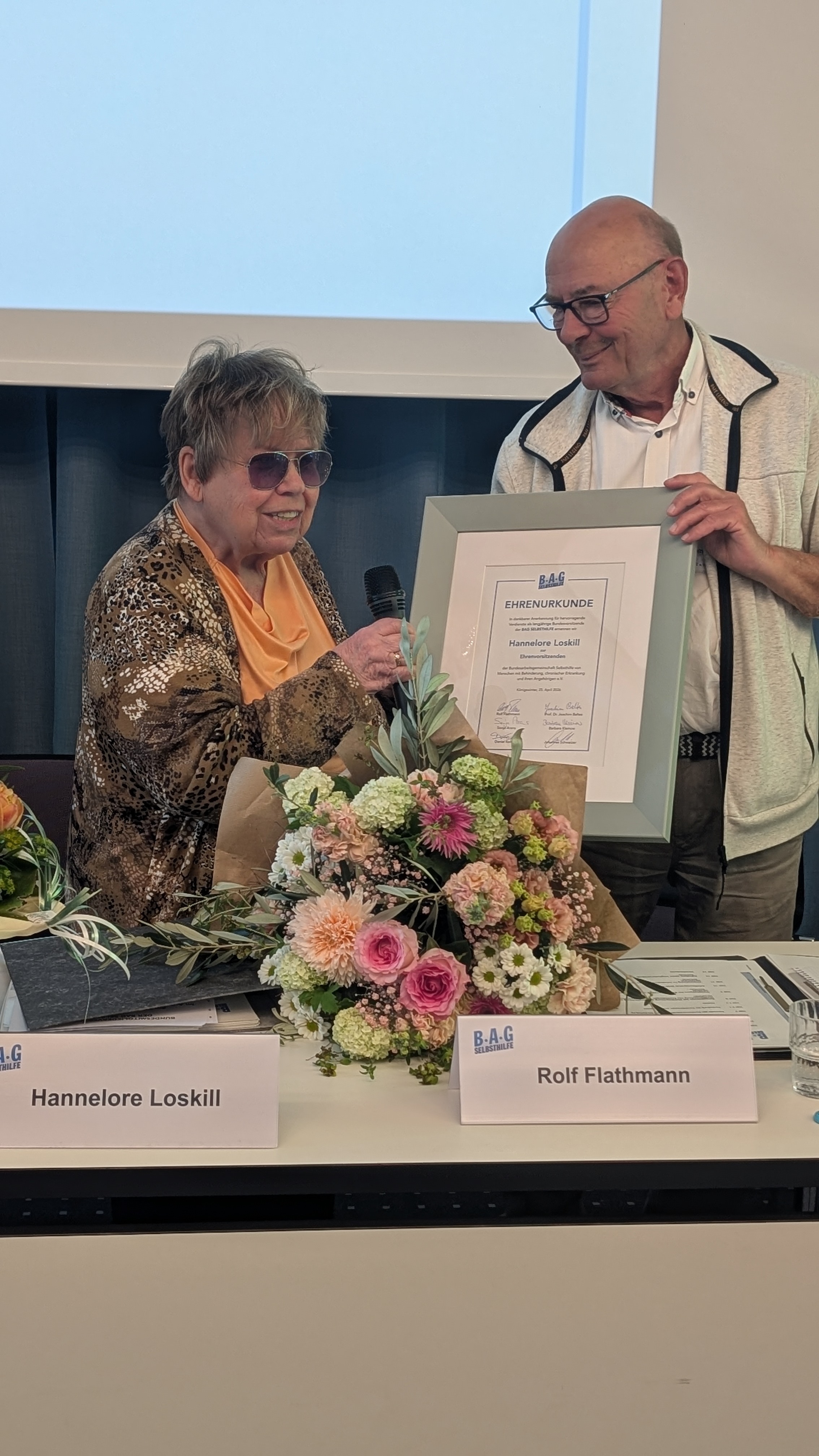 Ein besonderer Moment der Versammlung war die Ehrung der langjährigen Vorsitzenden Hannelore Loskill. In Anerkennung ihres herausragenden Engagements wurde sie zur Ehrenvorsitzenden ernannt und erhielt feierlich eine Urkunde.
